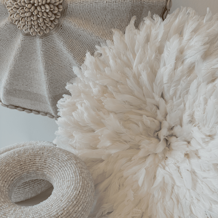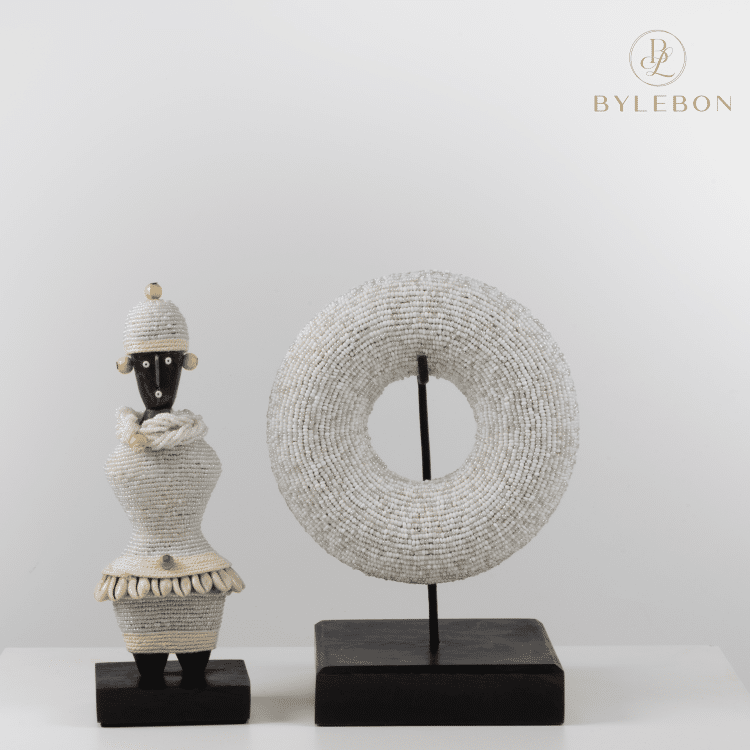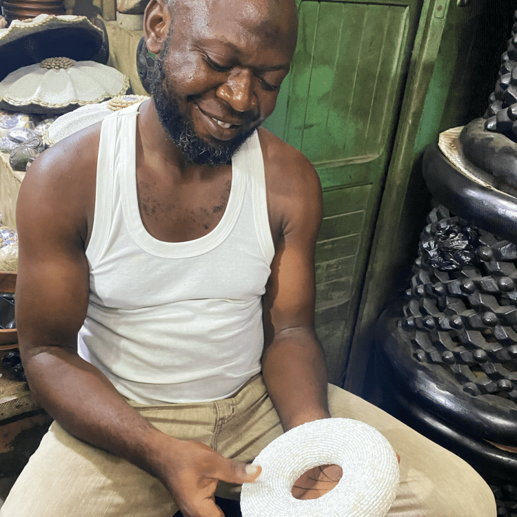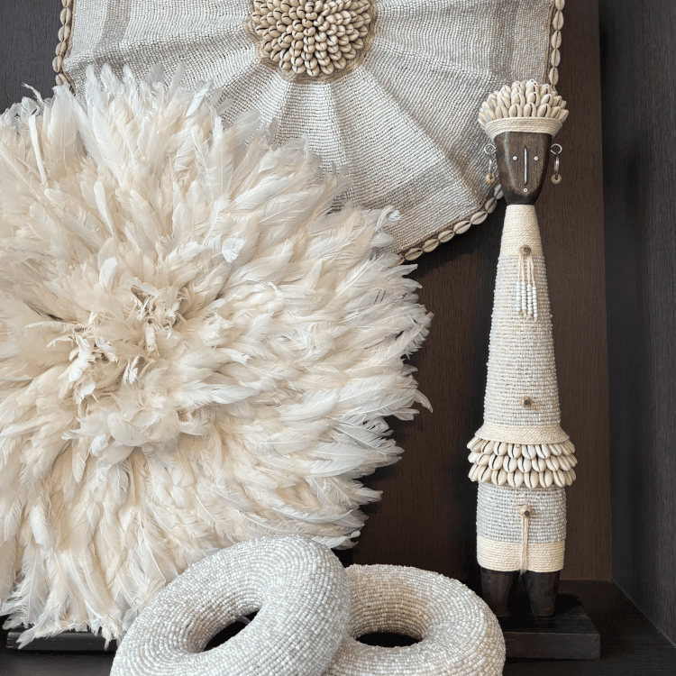 Deze mooie armband is met de hand gemaakt door Abil uit Kameroen. Hij heeft een diameter van ongeveer 17 cm en is versierd met kleine witte en parelmoer kraaltjes. Een uniek item dat niet alleen prachtig staat op de zwarte standaard, maar ook een echt verhaal met zich meebrengt. Perfect om je interieur een beetje extra sfeer te geven!