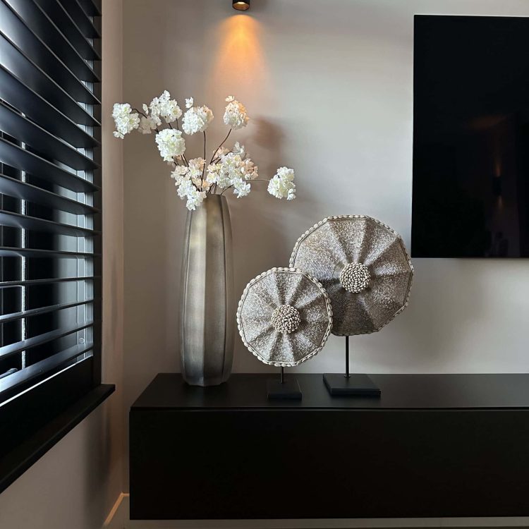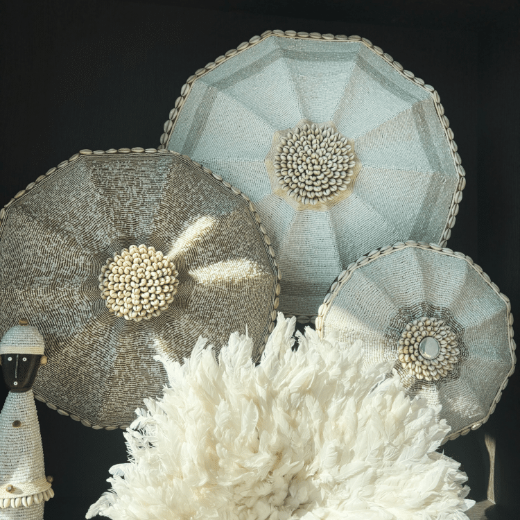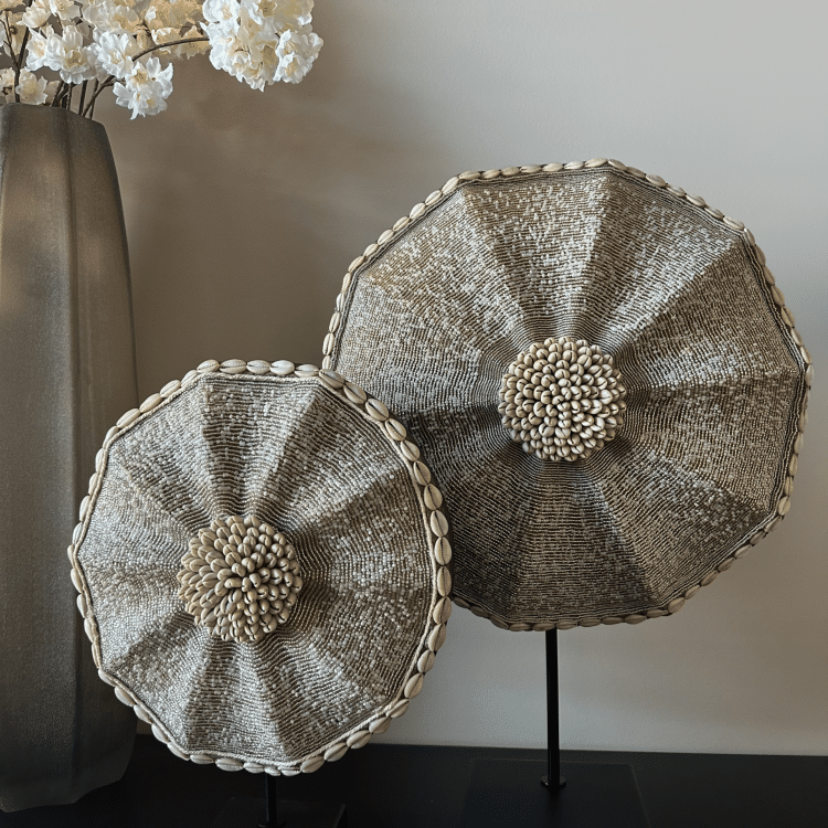 Het exclusieve Beaded Shield – Bianca (40cm) is het resultaat van een unieke samenwerking tussen ByLebon en Bianca (@huisje.in.parkzijde). Net als de 30cm– en 50cm variant is ook dit schild met veel aandacht voor detail gemaakt door echte vakmensen in Kameroen. De fijne glaskralen en subtiele wit- en ivoortinten zorgen voor een zachte gloed en staan perfect in verschillende interieurstijlen. Met je aankoop steun je eerlijke handel en betere leefomstandigheden voor de vaklieden in Kameroen.