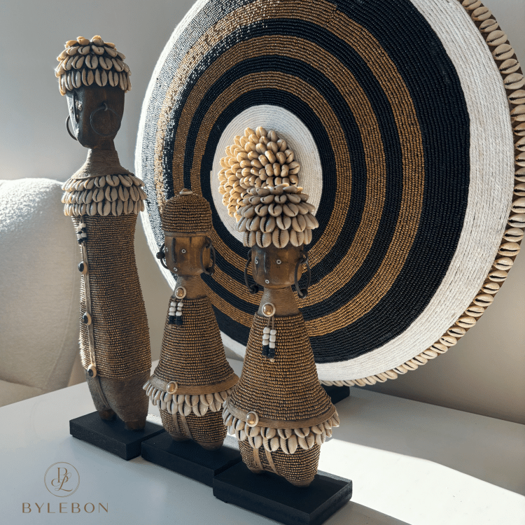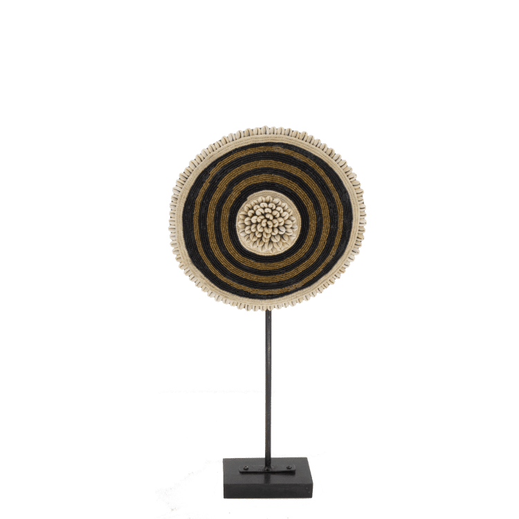 Beaded Shield – Linte is perfect voor zowel klassieke als moderne interieurs. Het schild heeft warme aardse tinten met cirkel-patronen in wit, zwart en bruin. Het schild is prachtig afgewerkt met een rand van cowrie schelpjes.