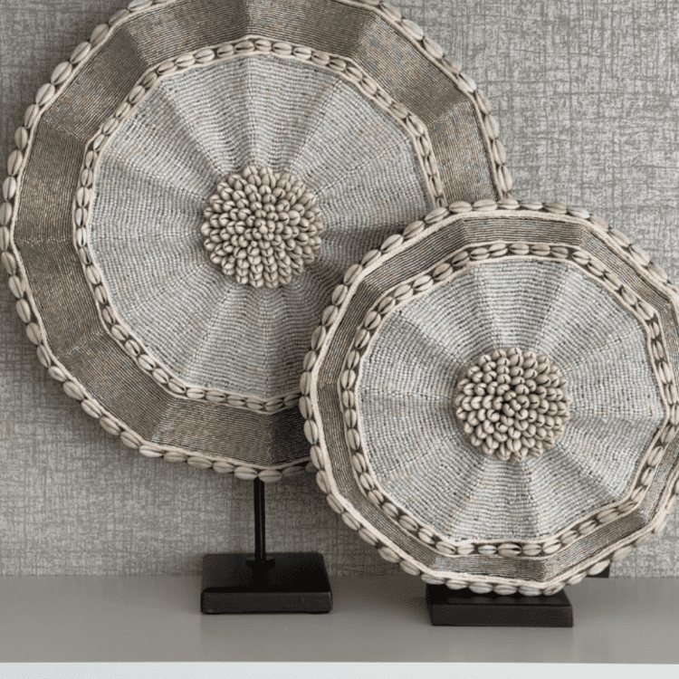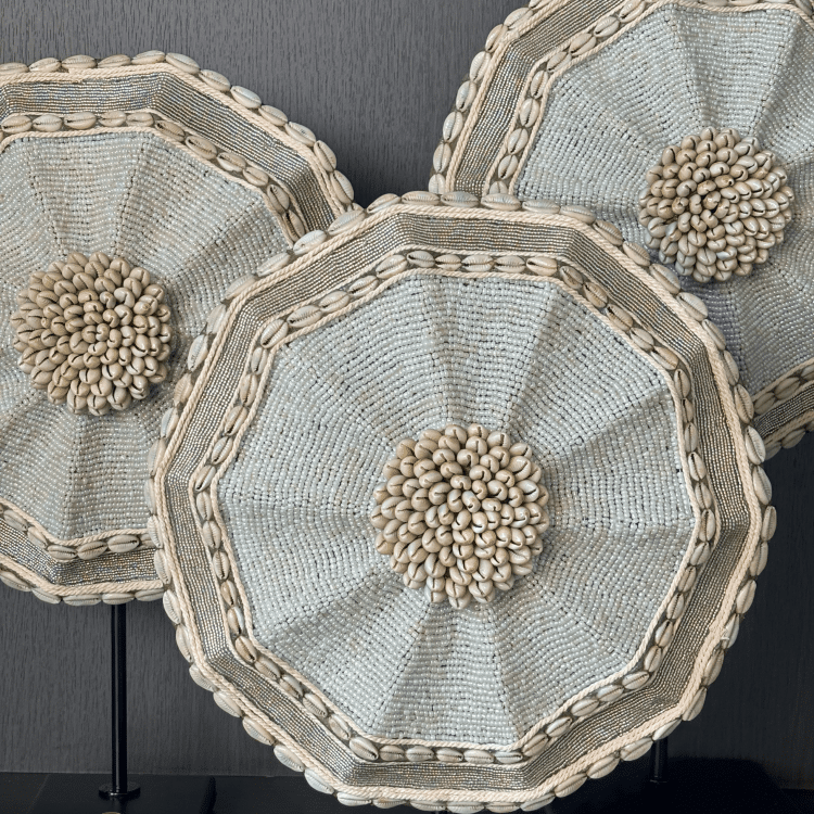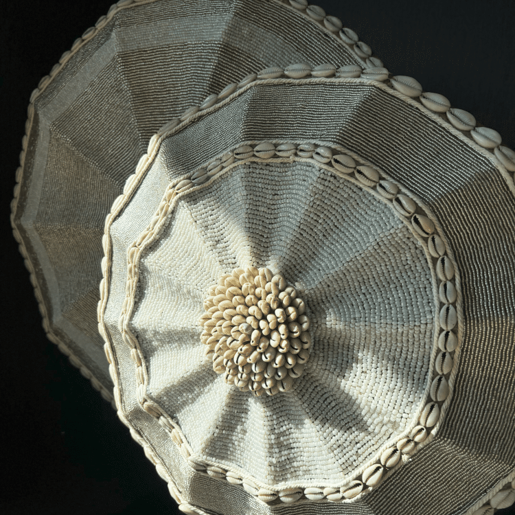 Het Beaded Shield – Wendy (40cm), ook wel het “Umbrella Shield” genoemd, kenmerkt zich door een golvende vorm met transparante kralen rondom. De kern van het schild bestaat uit een cirkel van zorgvuldig geplaatste cowrie-schelpjes, die traditioneel staan voor voorspoed en geluk. De rand is afgewerkt met transparante kralen rondom de parelmoer kern.