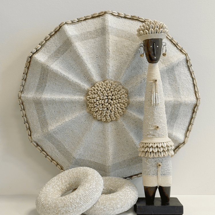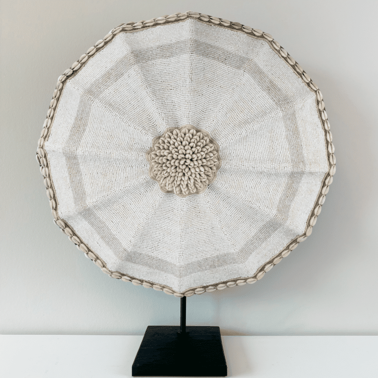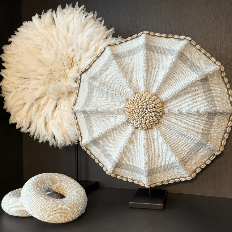 De kern van het Beaded Shield – White Pearl bestaat uit een cirkel van cowrie-schelpjes, die al eeuwenlang symbool staan voor welvaart en geluk.