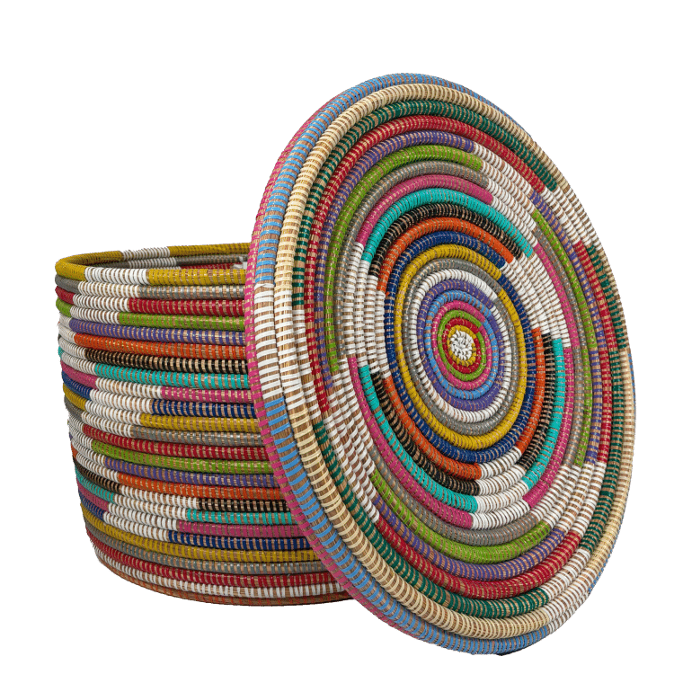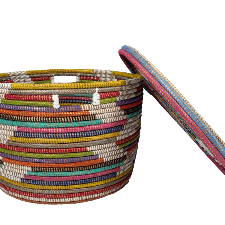De “Mand met deksel – Jolie” is handgemaakt in Senegal van duurzaam riet. Met een uniek vrolijk een kleurrijk patroon en een praktisch formaat is de mand ideaal voor het opbergen van allerlei spullen, terwijl het deksel alles mooi opgeruimd er uit doet laten zien. Super leuk in de woon- slaap of kinderkamer.