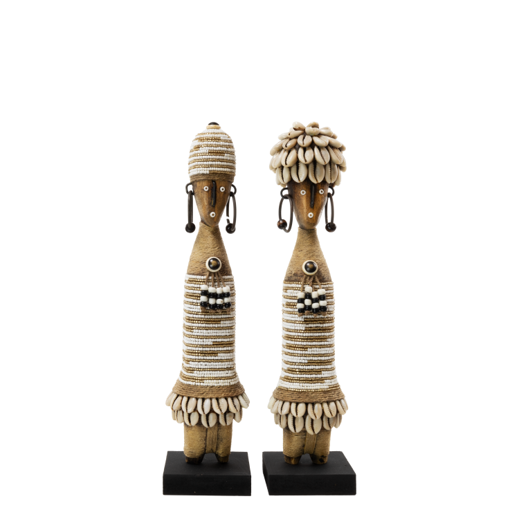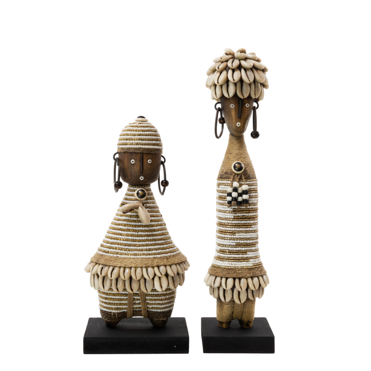 De Namji Doll – C2 (28 cm) is een compact maar opvallend decoratief beeld, volledig met de hand gemaakt. Deze Namji is gedetailleerd afgewerkt met cowrie schelpen rond het hoofd en onderzijde, fijn touwwerk en een combinatie van neutrale kralen die samen een rustig maar karakteristiek geheel vormen. Het decoratieve middensymbool op de borst geeft het beeld extra diepte en een authentieke uitstraling.