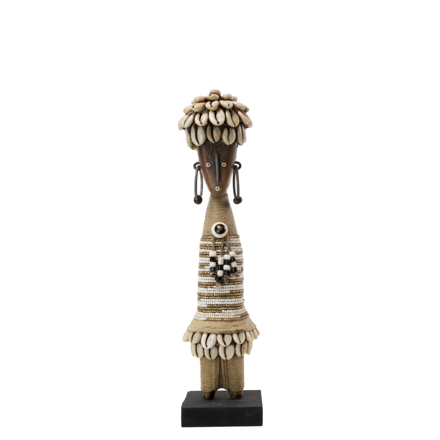 De Namji Doll – C2 (28 cm) is een compact maar opvallend decoratief beeld, volledig met de hand gemaakt. Deze Namji is gedetailleerd afgewerkt met cowrie schelpen rond het hoofd en onderzijde, fijn touwwerk en een combinatie van neutrale kralen die samen een rustig maar karakteristiek geheel vormen. Het decoratieve middensymbool op de borst geeft het beeld extra diepte en een authentieke uitstraling.