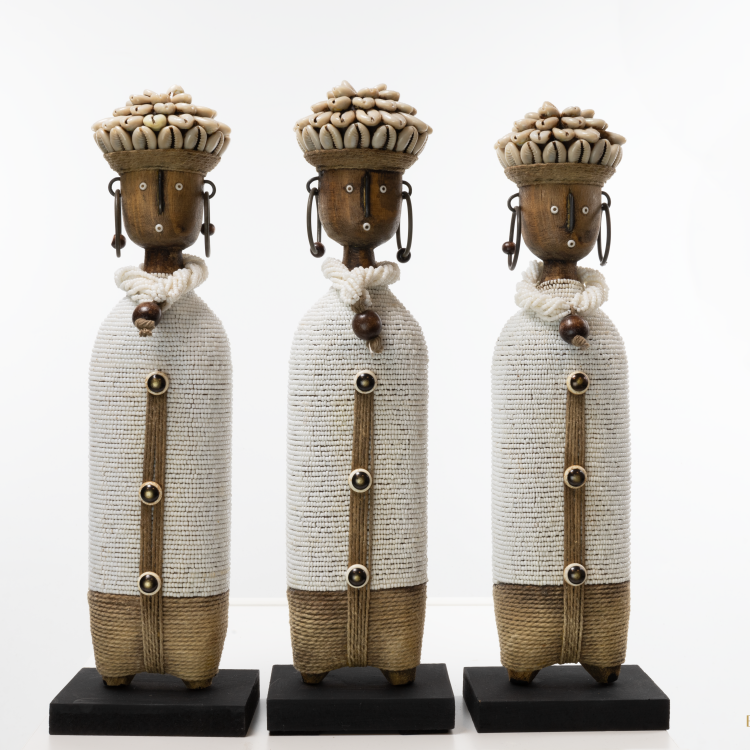 De Namji Doll – E12 (34 cm) is een elegante en hoog afgewerkte Namji pop, volledig met de hand gemaakt volgens traditioneel vakmanschap. Deze uitvoering valt op door het fijne witte kralenwerk dat als een strak geheel om het lichaam is gewikkeld, afgewisseld met een verticale touwstructuur en metalen accenten. Het hoofd is rijk versierd met cowrie schelpen, wat dit beeld een bijzonder sierlijke uitstraling geeft.