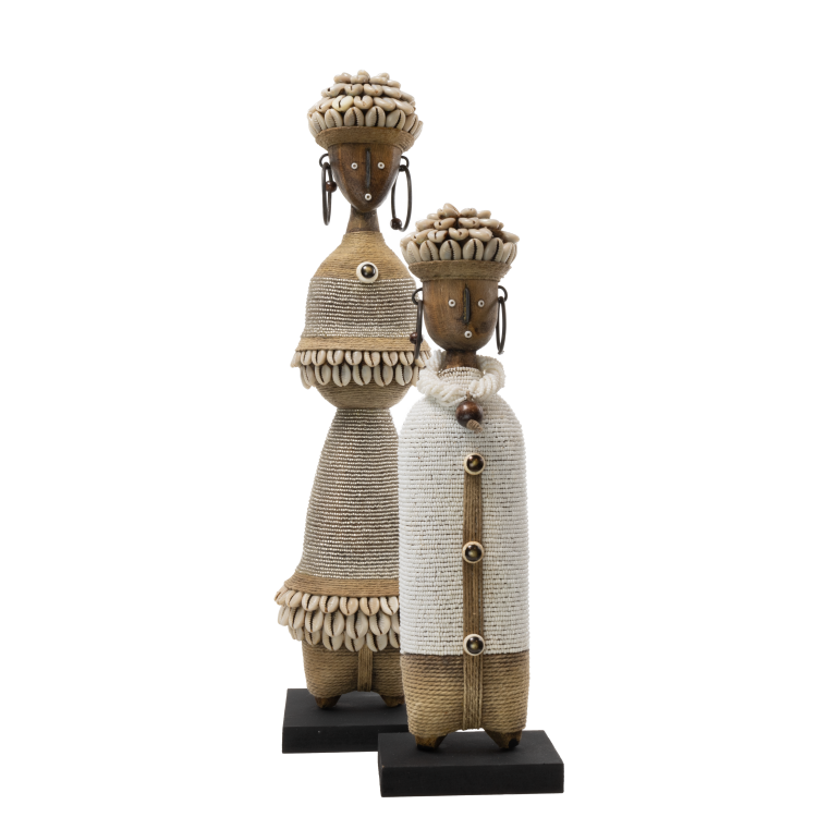 De subtiele houten details, de kralenhanger bij de hals en de symmetrische afwerking maken dit een tijdloos decoratiestuk dat zowel in moderne als warme interieurs prachtig tot zijn recht komt. Mooi als blikvanger in woonkamer, hal of slaapkamer. Perfect voor interieurs die zoeken naar een authentiek handgemaakt item met rustige, natuurlijke kleuren.