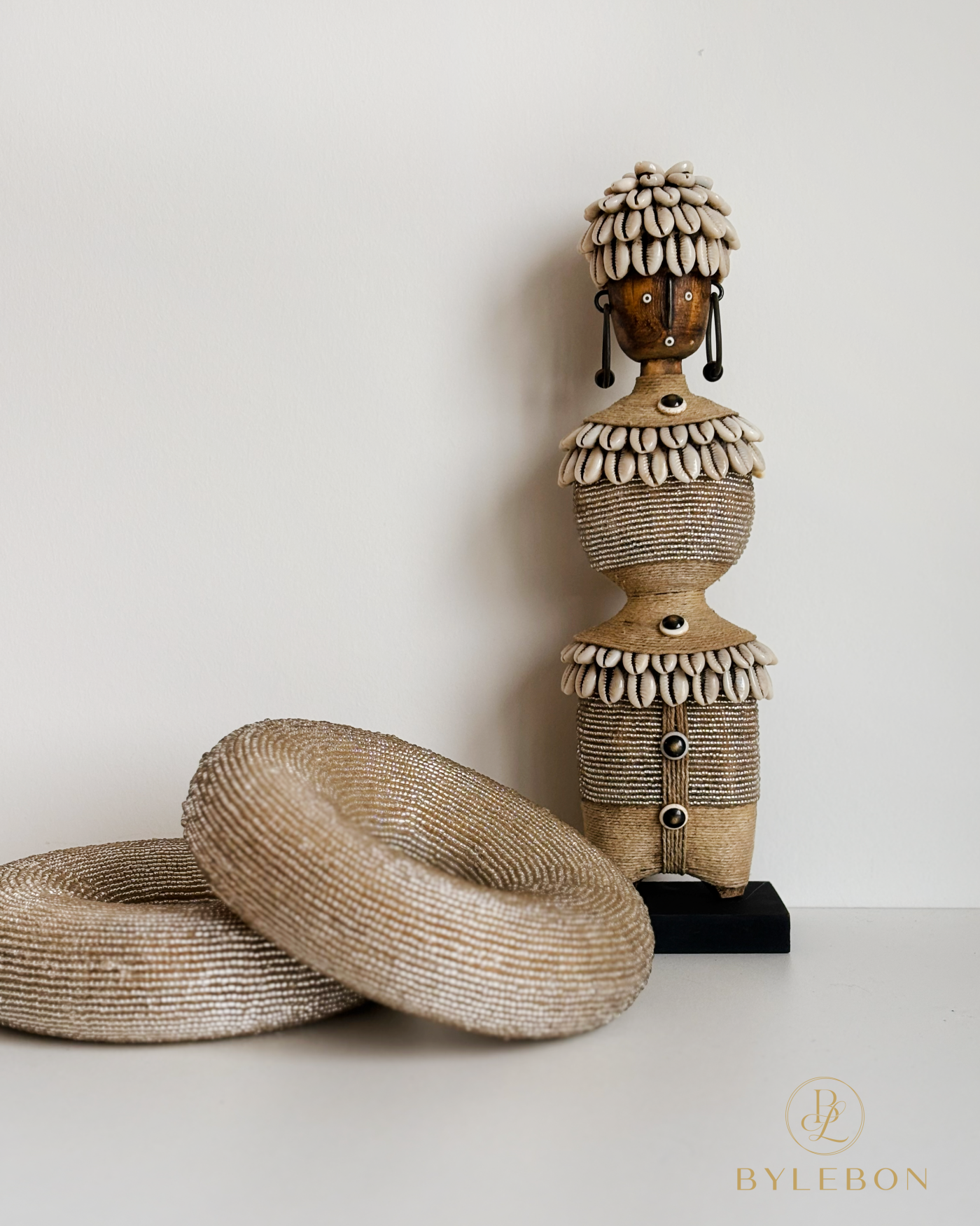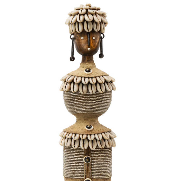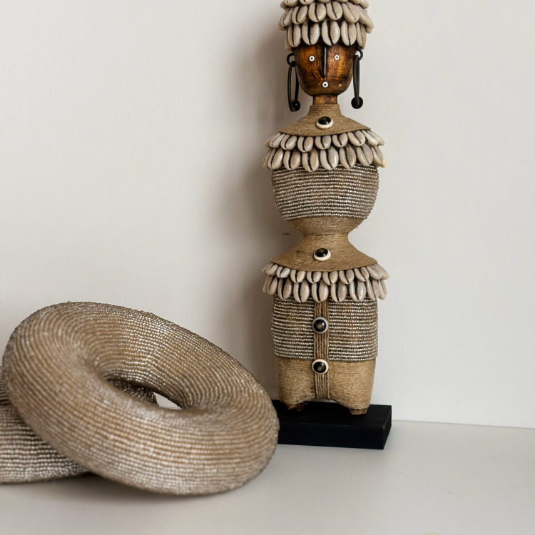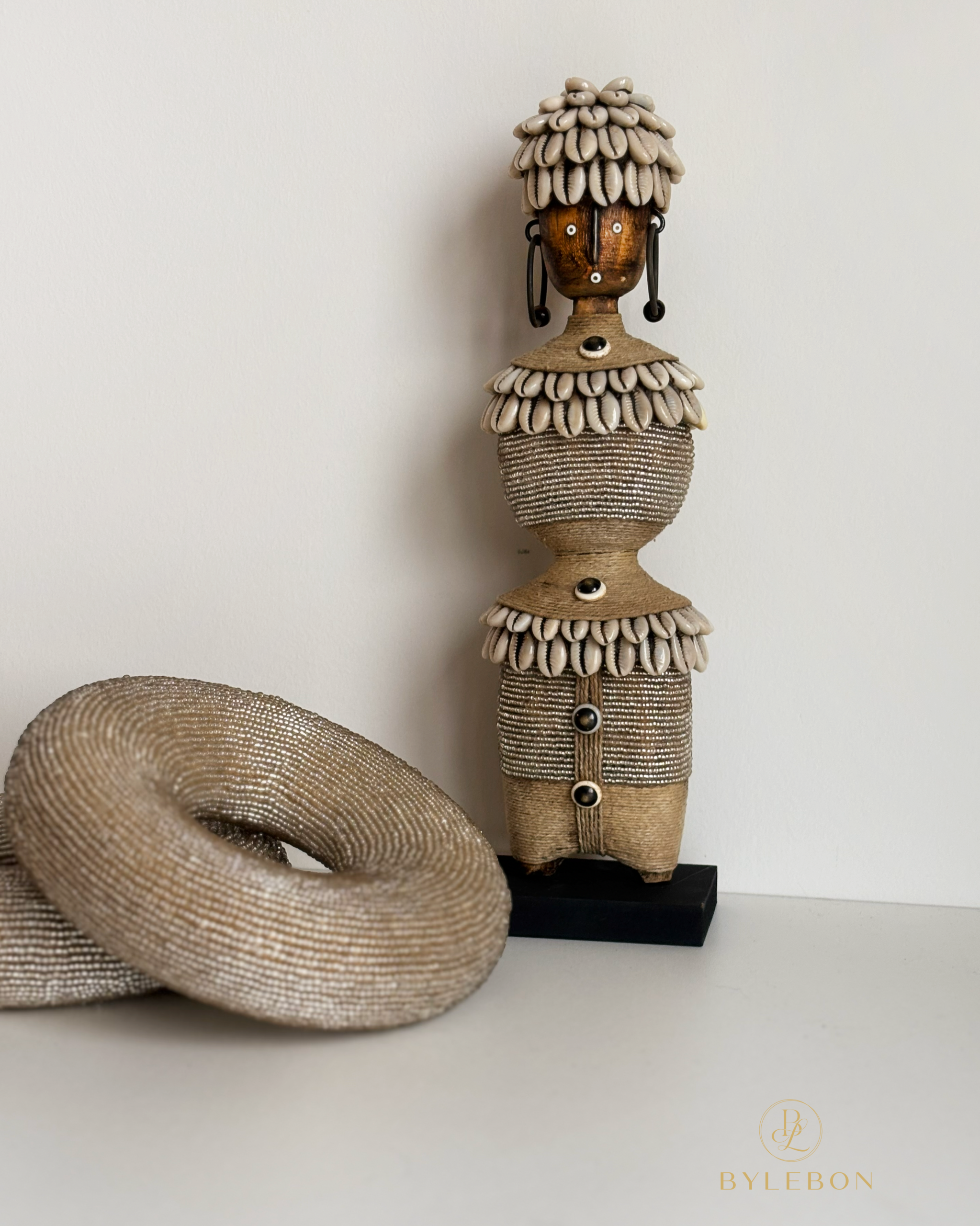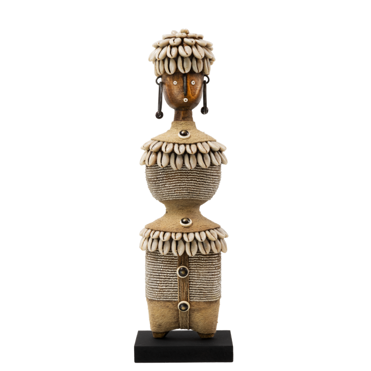 Een prachtig handgemaakte Namji Doll – E6 van ongeveer 34 cm hoog. Rijk gedetailleerd met fijne kralen, touw en cowrie schelpen. Het ontwerp heeft een luxe uitstraling en staat stevig op een zwarte sokkel.