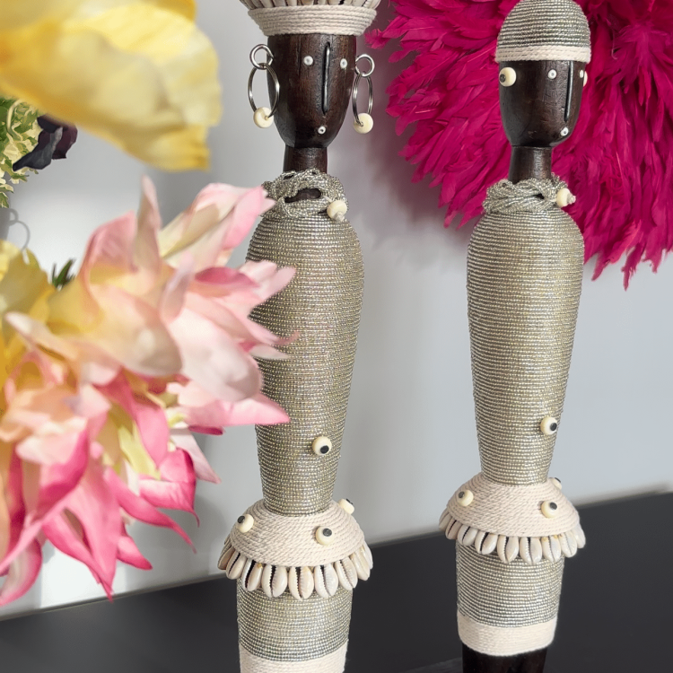 Deze authentieke Namji Doll – H1 is vrij hoog en rijkelijk met de hand versierd, o.a. met cowrie-schelpen, kralen, touw en metalen details. Het is een stijlvol symbool van geluk en vruchtbaarheid, perfect als uniek decoratiestuk of bijzonder cadeau.