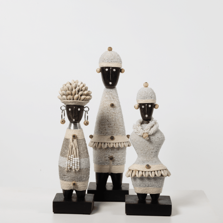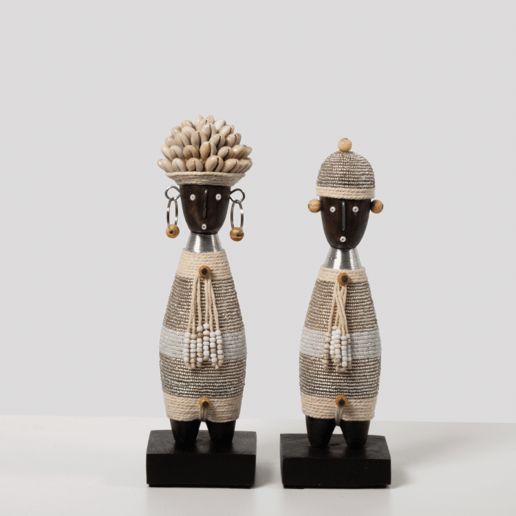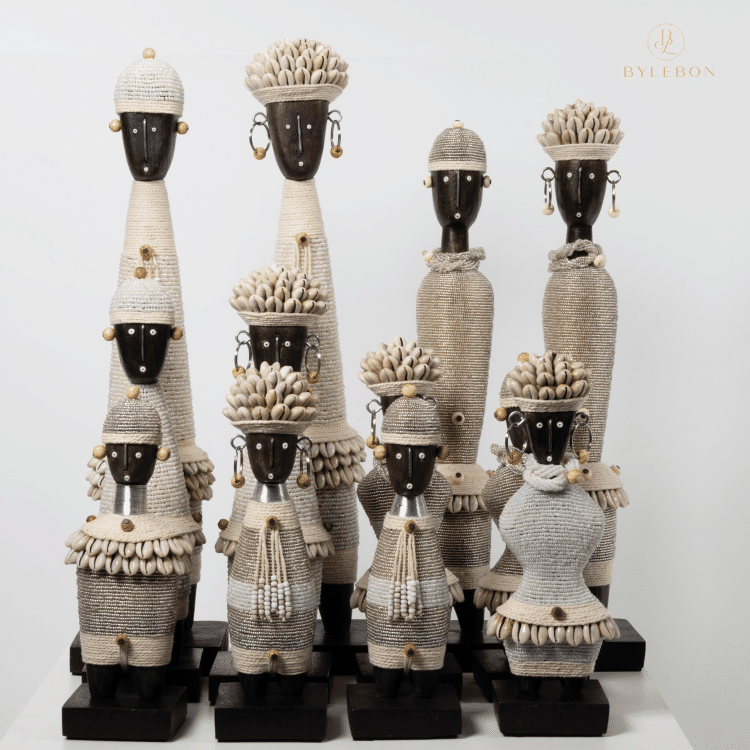 Unieke Namji Doll – I1, rijkelijk gedecoreerd en met neutrale tinten die perfect passen in elk interieur. Geleverd op een zwart platform.
