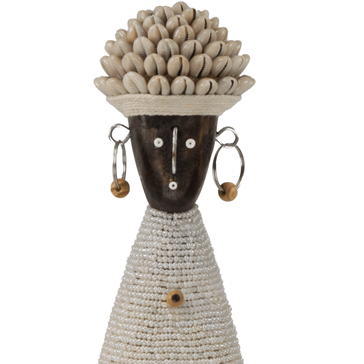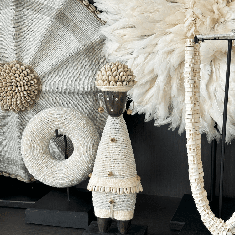 Deze Namji Doll – J1 is een uniek kunstwerk, rijkelijk versierd met parelmoer kralen en fijne details. Het subtiele en neutrale ontwerp maakt het een ideale aanvulling voor elk interieur, of het nu modern of traditioneel is. Geleverd op een elegant zwart platform, klaar om een speciale plek in uw huis in te nemen.