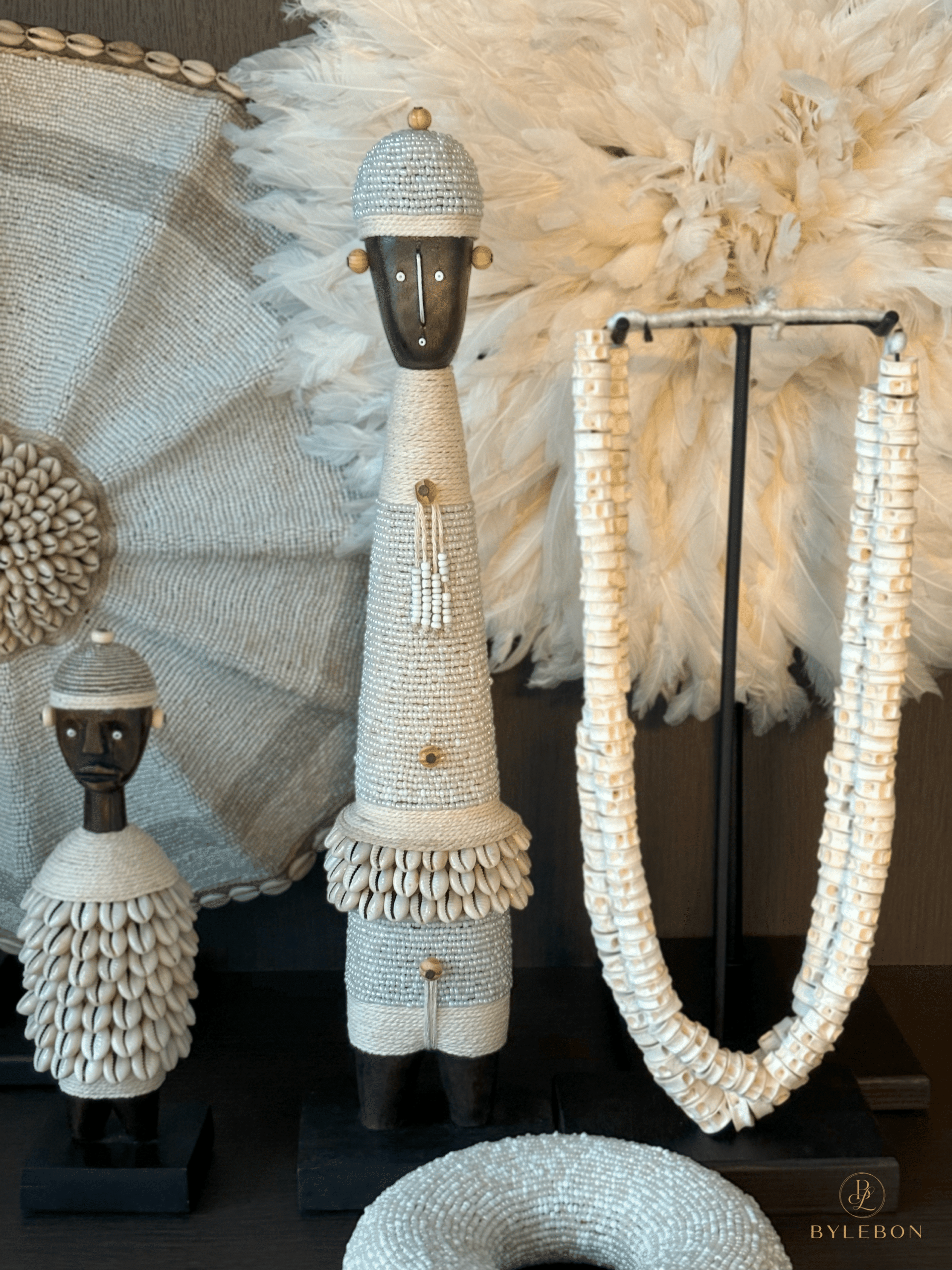 Deze Namji Doll – K2 is rijkelijk gedecoreerd met parelmoer kralen en vormt een bijzondere toevoeging aan elk interieur. Het neutrale ontwerp zorgt ervoor dat de pop moeiteloos in verschillende interieurstijlen past. Geleverd op een stijlvol zwart platform, is deze pop zowel een kunstobject als een decoratief element.