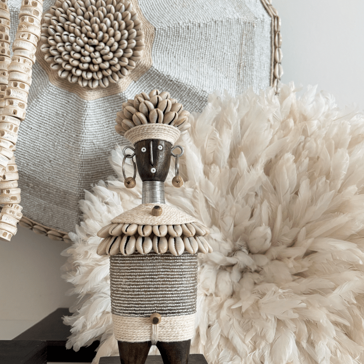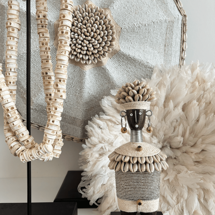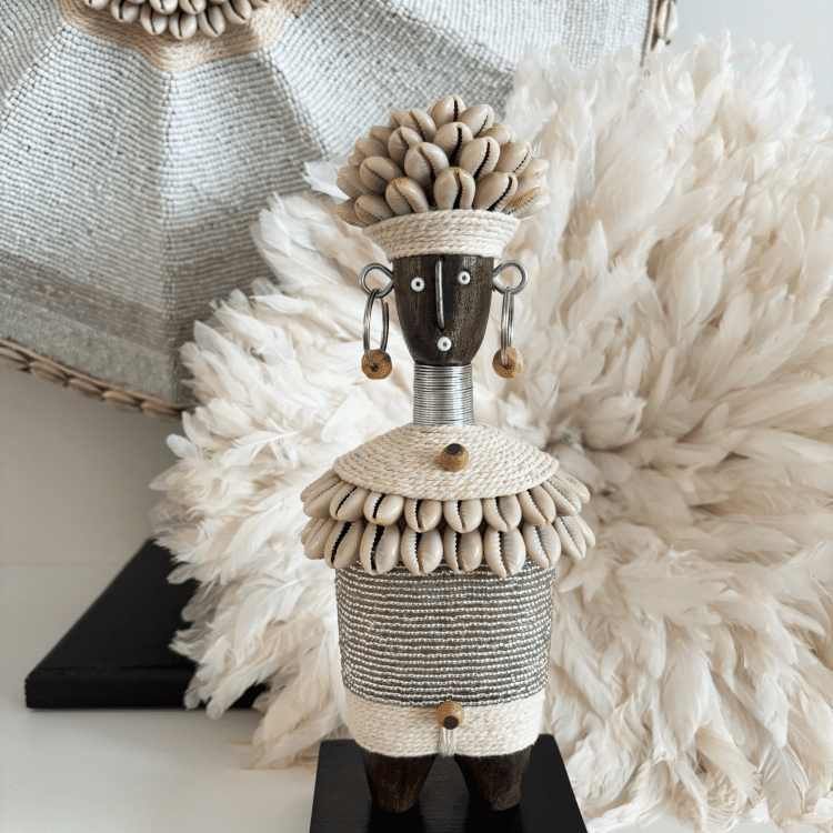 Unieke Namji Doll – L1, prachtig gedecoreerd en uitgevoerd in neutrale tinten die moeiteloos harmoniëren met ieder interieur. Gepresenteerd op een stijlvol zwart platform.