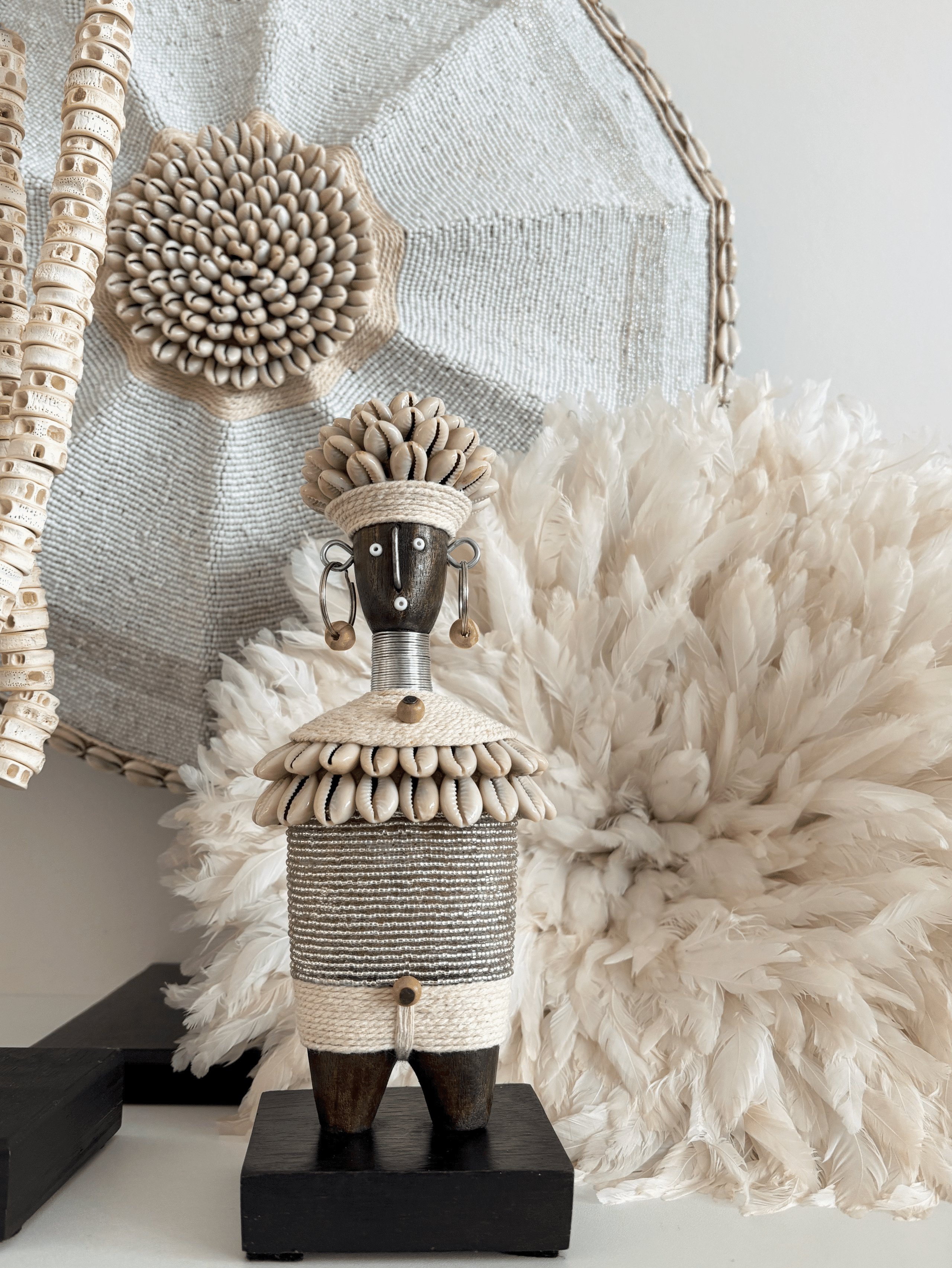 Unieke Namji Doll – L1, prachtig gedecoreerd en uitgevoerd in neutrale tinten die moeiteloos harmoniëren met ieder interieur. Gepresenteerd op een stijlvol zwart platform.