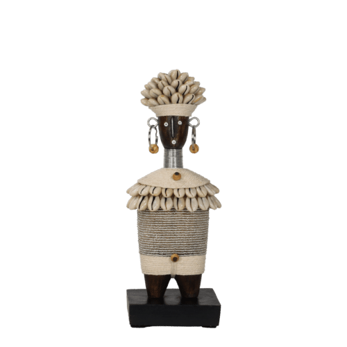 Deze authentieke Namji Doll – L1 is met de hand prachtig gedecoreerd met cowrie-schelpen, kralen, touw en metalen accenten. Een stijlvol symbool van geluk en vruchtbaarheid, ideaal als uniek decoratiestuk of een bijzonder geschenk.