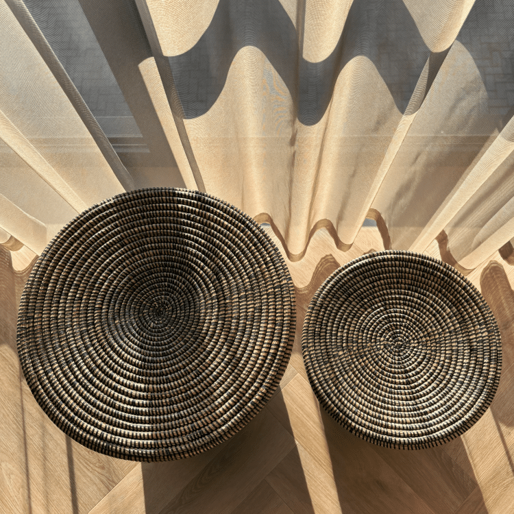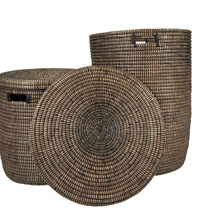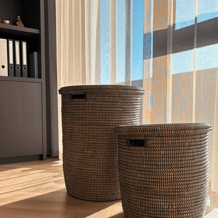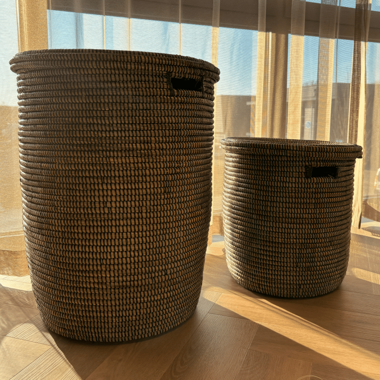 - De grote mand (57cm hoog, 40 cm diameter) de kleine mand (37 cm hoog, 35 cm diameter) in een elegante donkere kleur.