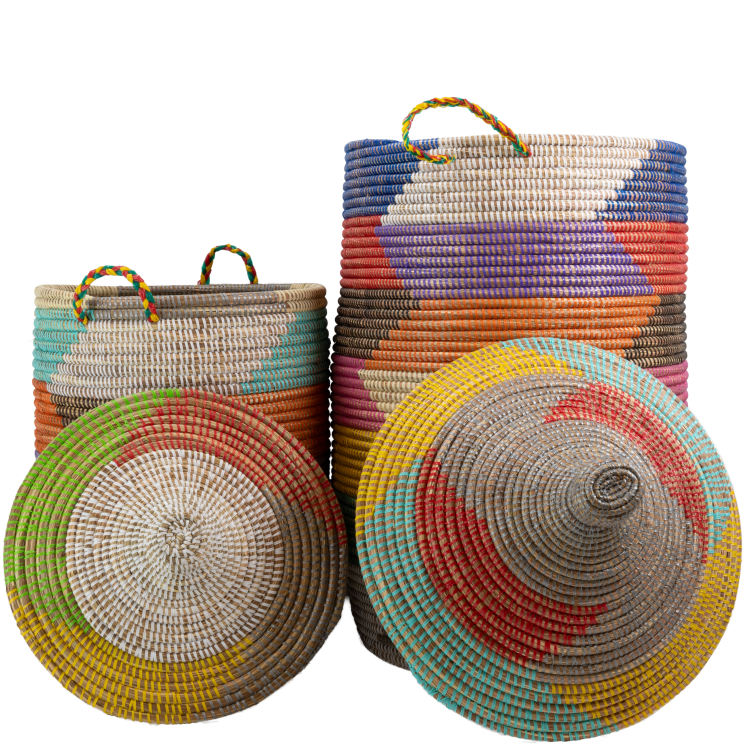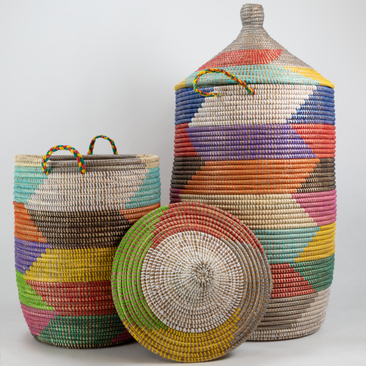 De Set Tajine Manden – Gekleurd Trapeze combineert authentiek Senegalees vakmanschap met een levendig vlechtpatroon in meerdere kleuren. Het stevige, met de hand gevlochten riet ventileert goed en houdt je wasgoed fris en droog.