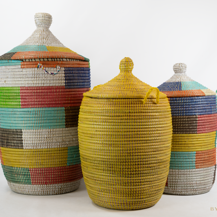 Deze Set Tajine Manden – Gekleurde vlakken geeft een vrolijke touch aan je slaap- of badkamer. Gebruik ze als opbergmand voor kleden, kleding of gewoon als wasmand. Het zijn twee stevige met de hand gevlochten (was)manden die goed ademen.