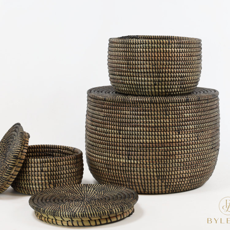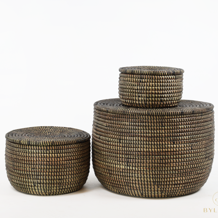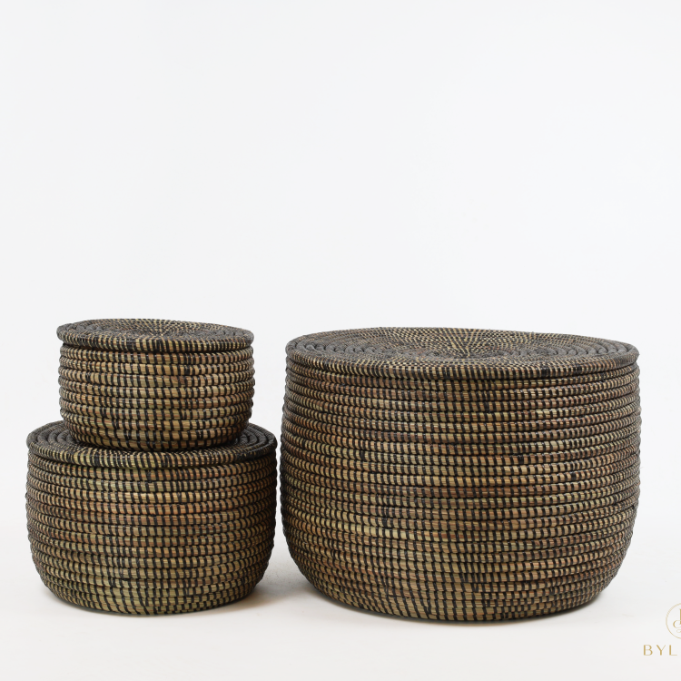 Set van 3 handgevlochten bruine opbergmanden met platte deksels. Ideaal voor het opbergen van kleine spullen in woonkamer, badkamer, keuken of kinderkamer.