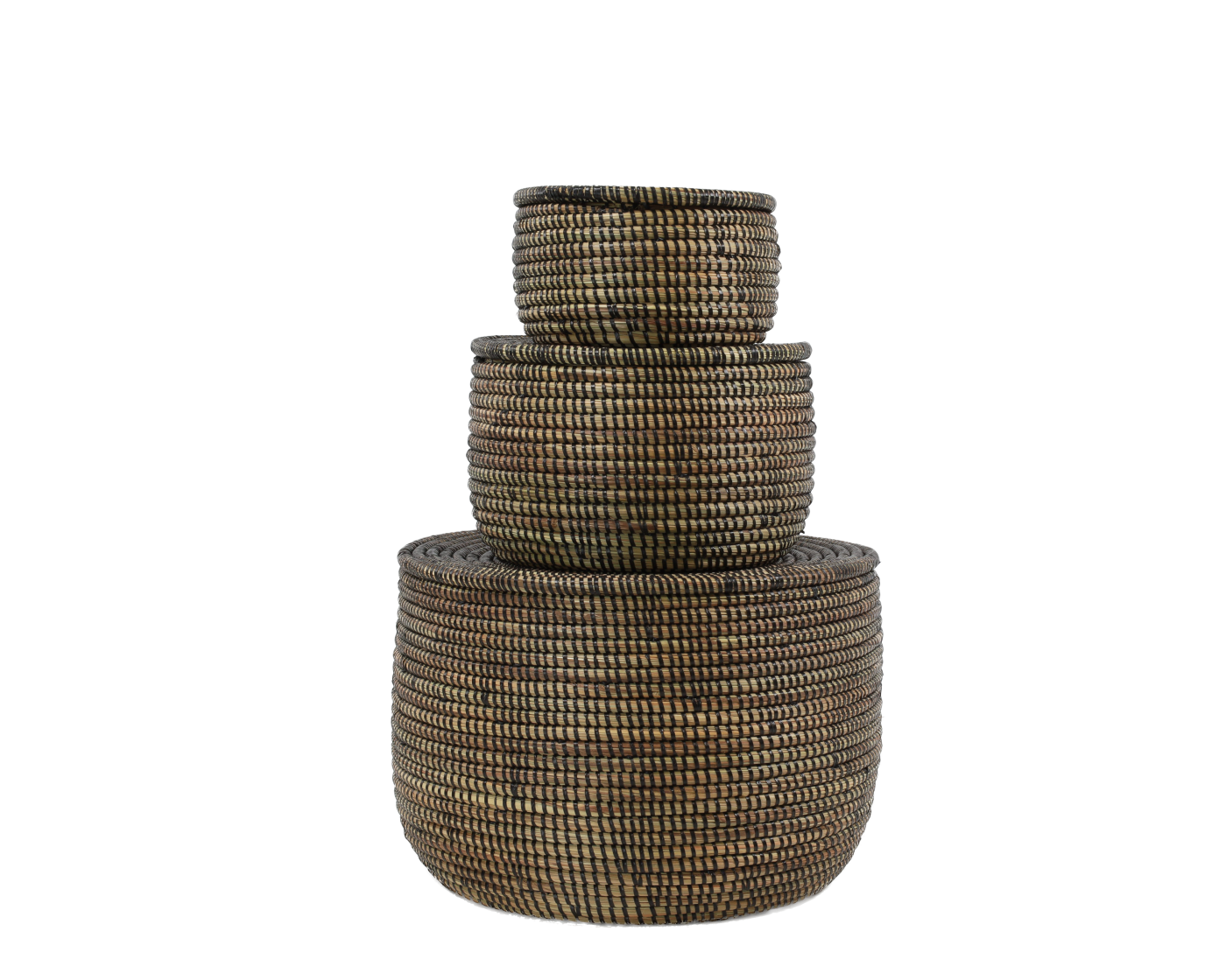 Set van 3 handgevlochten bruine opbergmanden met platte deksels. Ideaal voor het opbergen van kleine spullen in woonkamer, badkamer, keuken of kinderkamer.