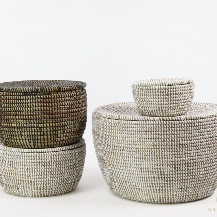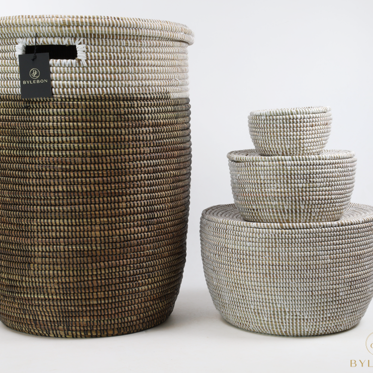 De Set van 3 Opbergmanden – Wit (met platte deksel) bestaat uit drie handgevlochten rieten manden met diameters van 18, 27 en 37 cm. De lichte wit-naturel kleur en de strakke platte deksels zorgen voor een rustige, frisse uitstraling die goed past in moderne interieurs.