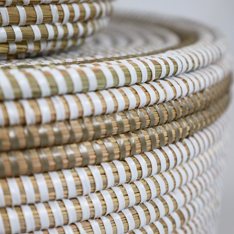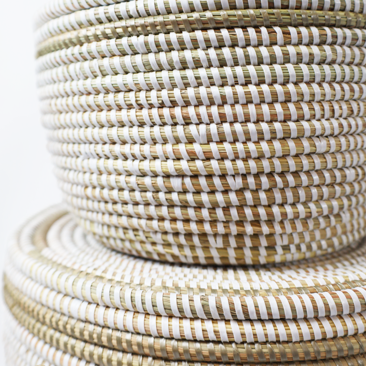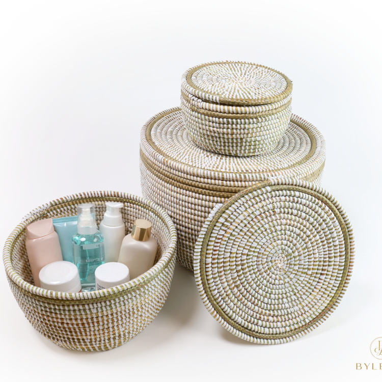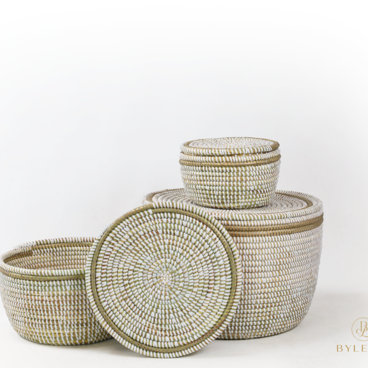 Set van 3 handgevlochten opbergmanden in wit-naturel riet met een frisse champagnekleurige rand en platte deksels. Praktisch, licht en perfect voor het opbergen van kleine spullen in elke ruimte.