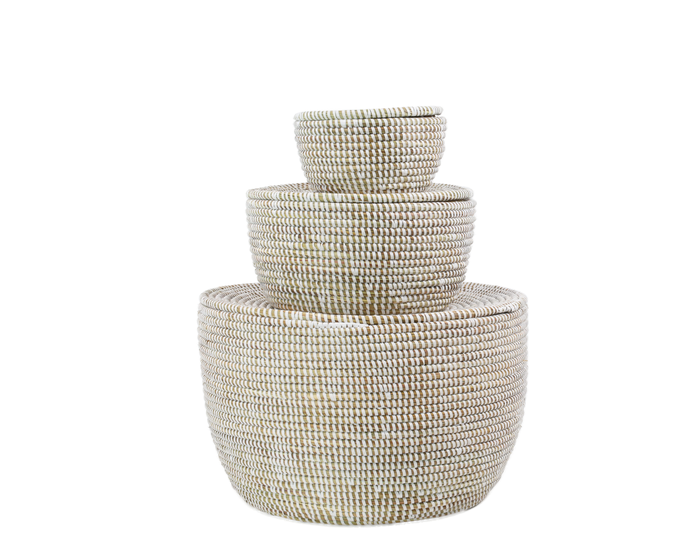De Set van 3 Opbergmanden – Wit (met platte deksel) bestaat uit drie handgevlochten rieten manden met diameters van 18, 27 en 37 cm. De lichte wit-naturel kleur en de strakke platte deksels zorgen voor een rustige, frisse uitstraling die goed past in moderne interieurs.
