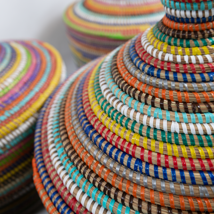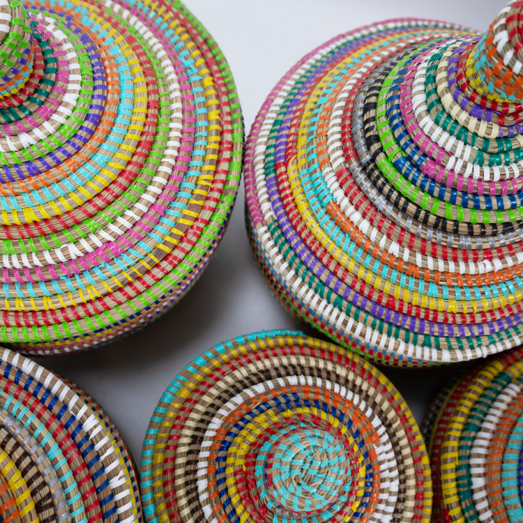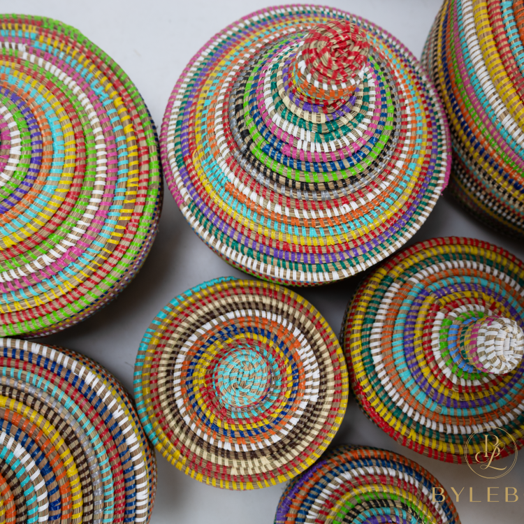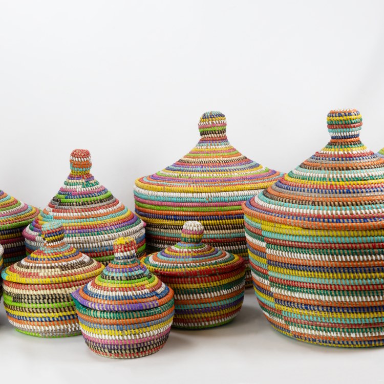 Set van 3 handgemaakte Tajine Mandjes – Regenboog, met hoogtes van 20, 23 en 44 cm en diameters van 18, 27 en 37 cm. Gemaakt van Senegalese riet en afgewerkt in vrolijke regenboogkleuren. Perfect als kleurrijke decoratie of compacte opbergruimte.