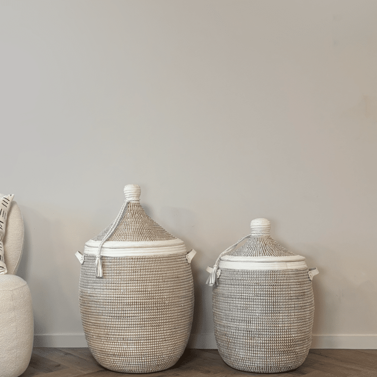 De Set Witte Manden Met Leder bestaat uit twee ronde manden met een witte lederen afwerking. Geschikt voor diverse spullen: van wasgoed en handdoeken tot kinderknuffels.