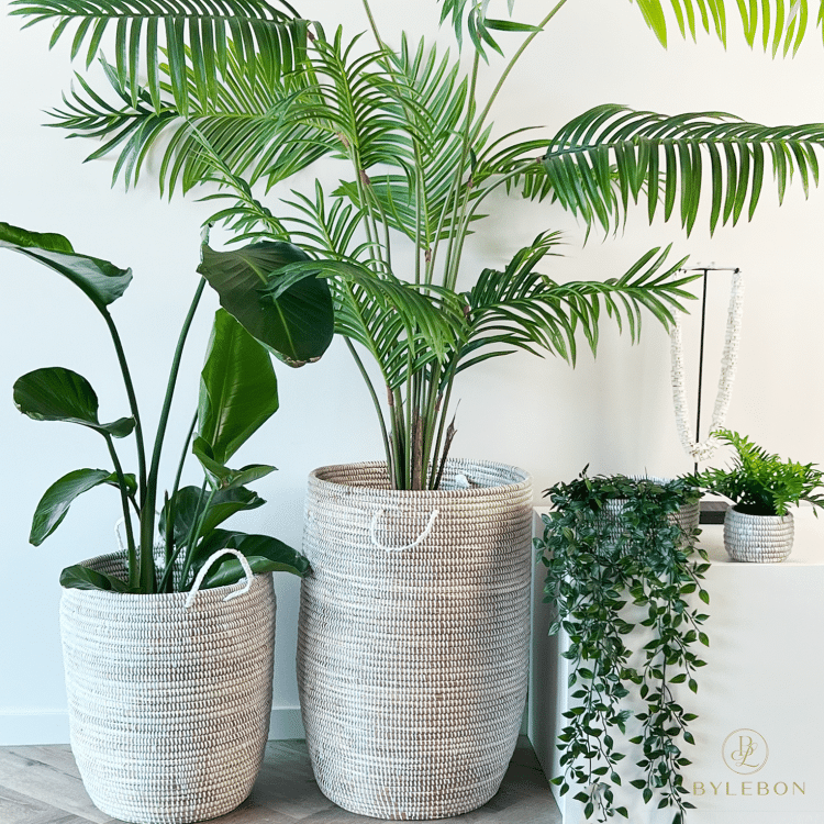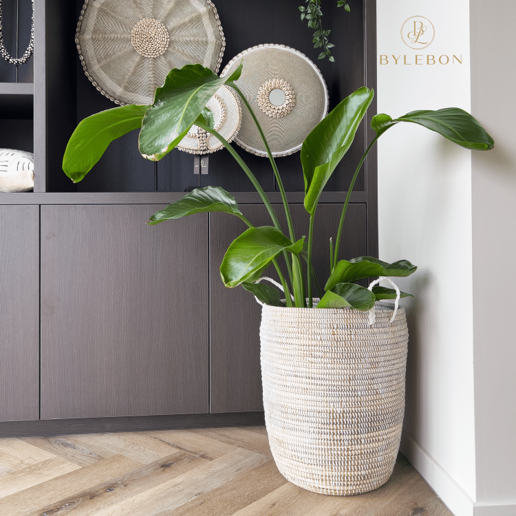 Gebruik ze voor wasgoed, plaids of speelgoed. Handgeweven riet zorgt voor stevigheid en eenvoudig onderhoud. Het wit-bruine contrast blijft fris. Zo heb je een duurzame mand met karakter.