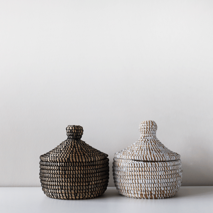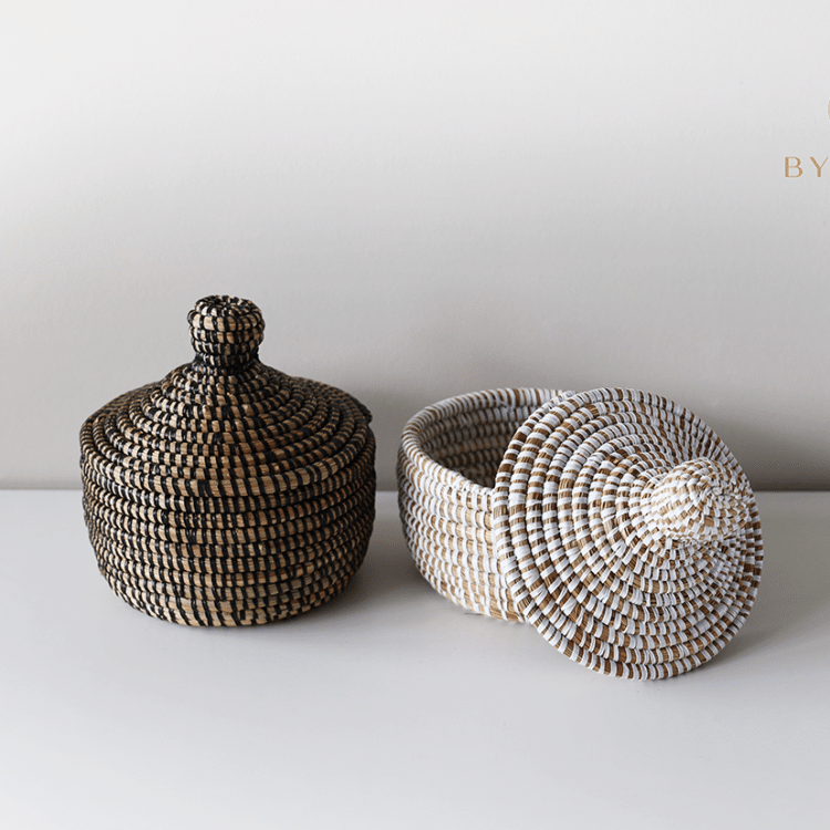 Compacte handgemaakte Tajine Mand XS – Bruin uit Senegal, ideaal voor het opbergen van sleutels of sieraden. Wit met een subtiel patroon, geschikt voor kleine ruimtes of decoratie.