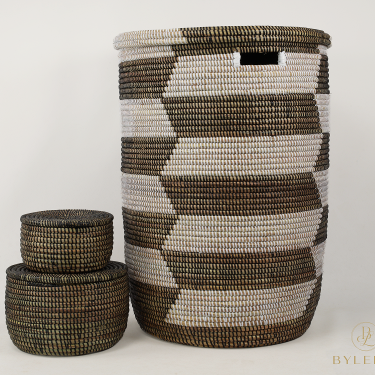 De Wasmand met deksel – Trapeze wit/zwart heeft een krachtige, grafische uitstraling door het contrasterende trapeze-patroon in zwart en wit. De mand is ruim van formaat en geschikt voor het opbergen van wasgoed, handdoeken of beddengoed. Dankzij de platte deksel blijft de inhoud netjes uit het zicht en oogt de ruimte opgeruimd.