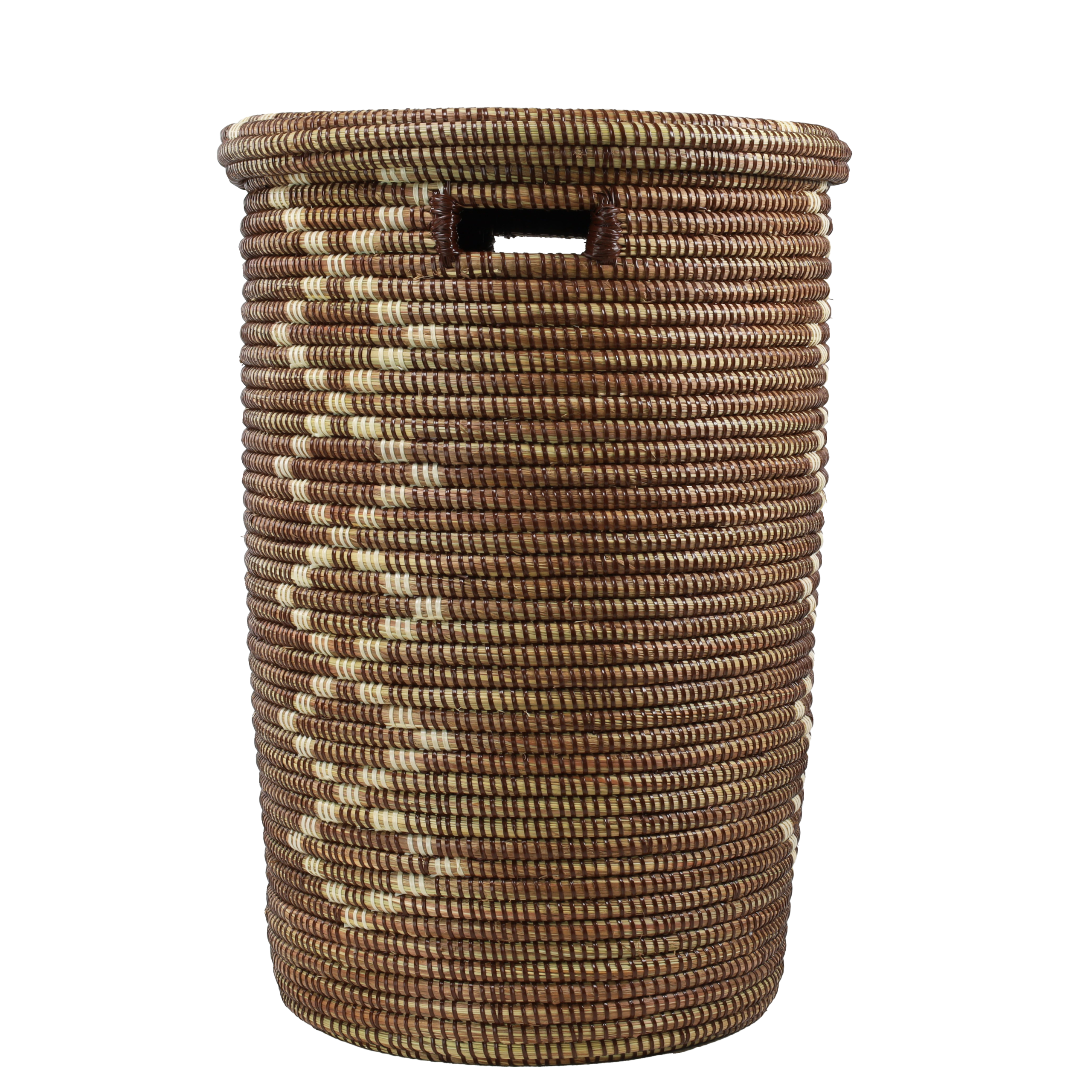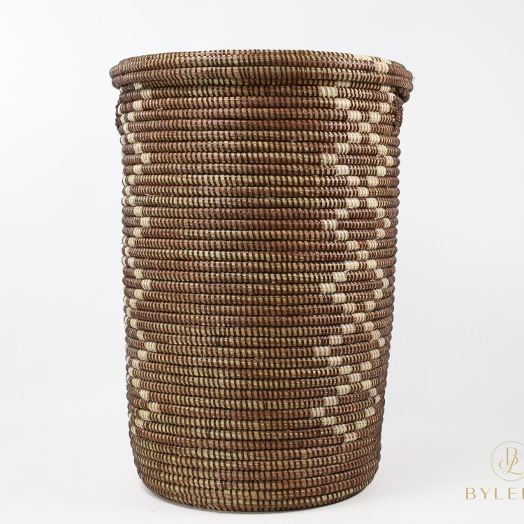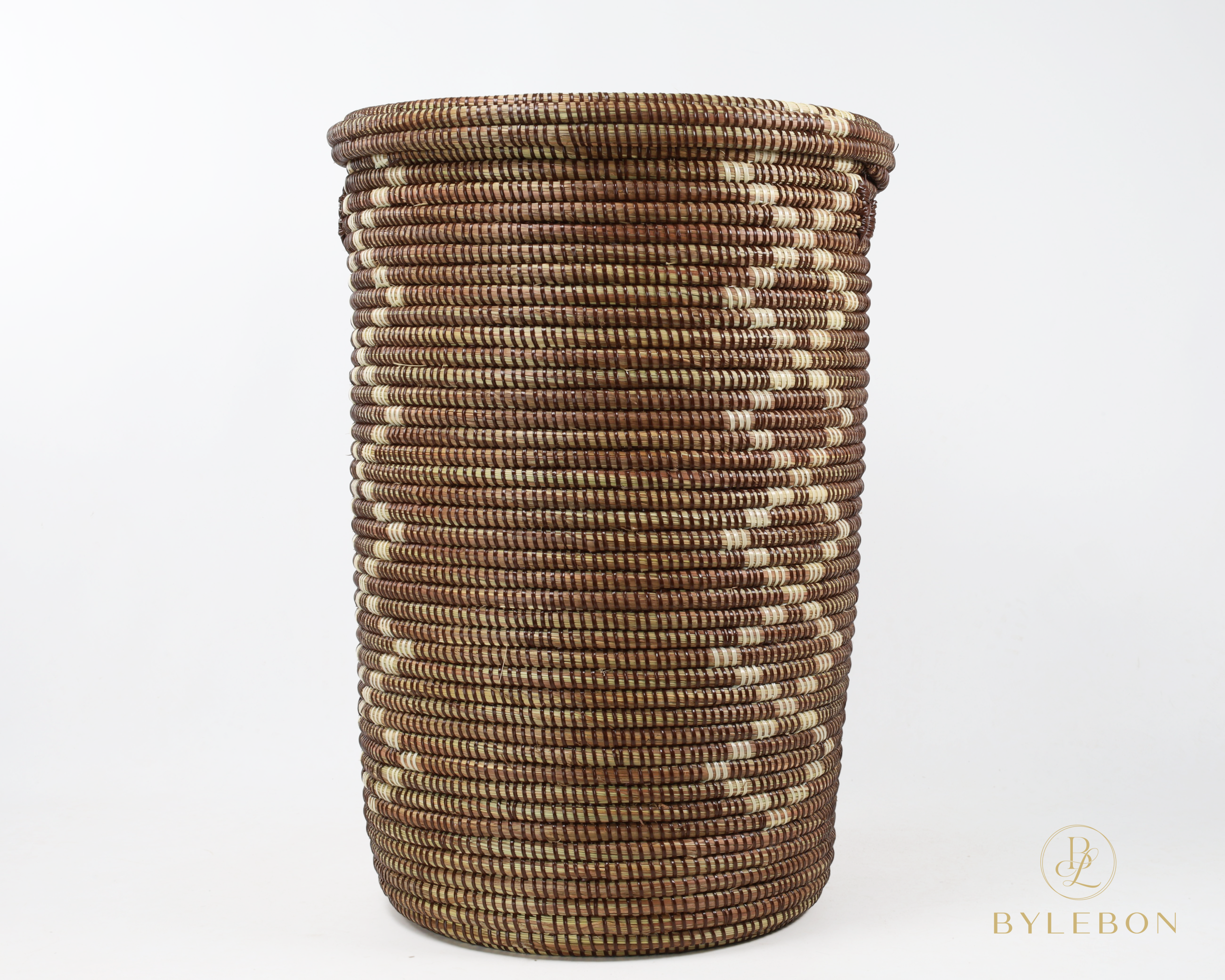 De Wasmand met deksel – ZigZag combineert praktisch gebruik met een moderne uitstraling. De mand is handgevlochten in een warme bruine tint en heeft een strak zigzag patroon dat direct opvalt maar toch rustig blijft in het interieur. Met een diameter van ca. 40 cm en een hoogte van ca. 60 cm biedt de mand voldoende ruimte voor kleding, handdoeken of beddengoed.