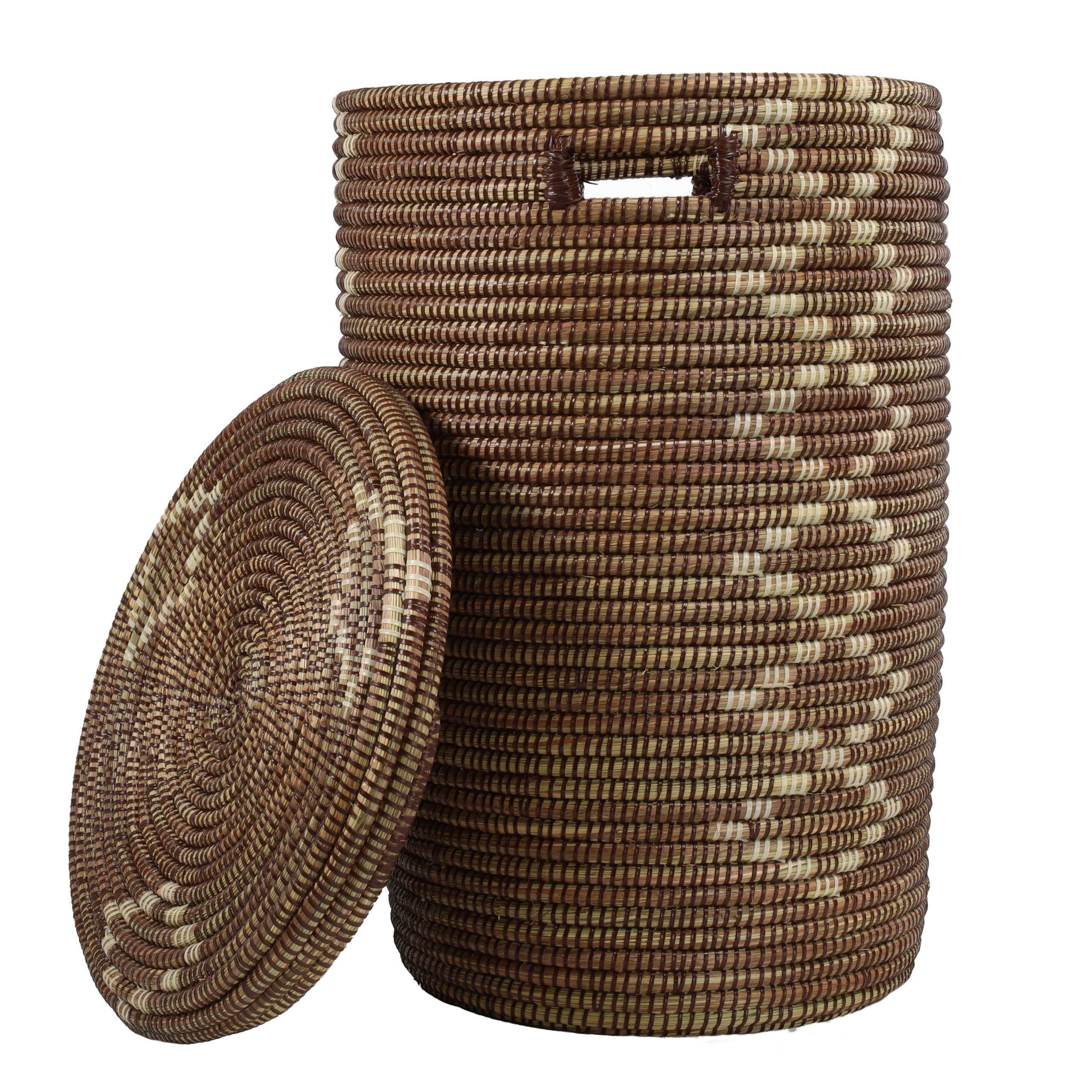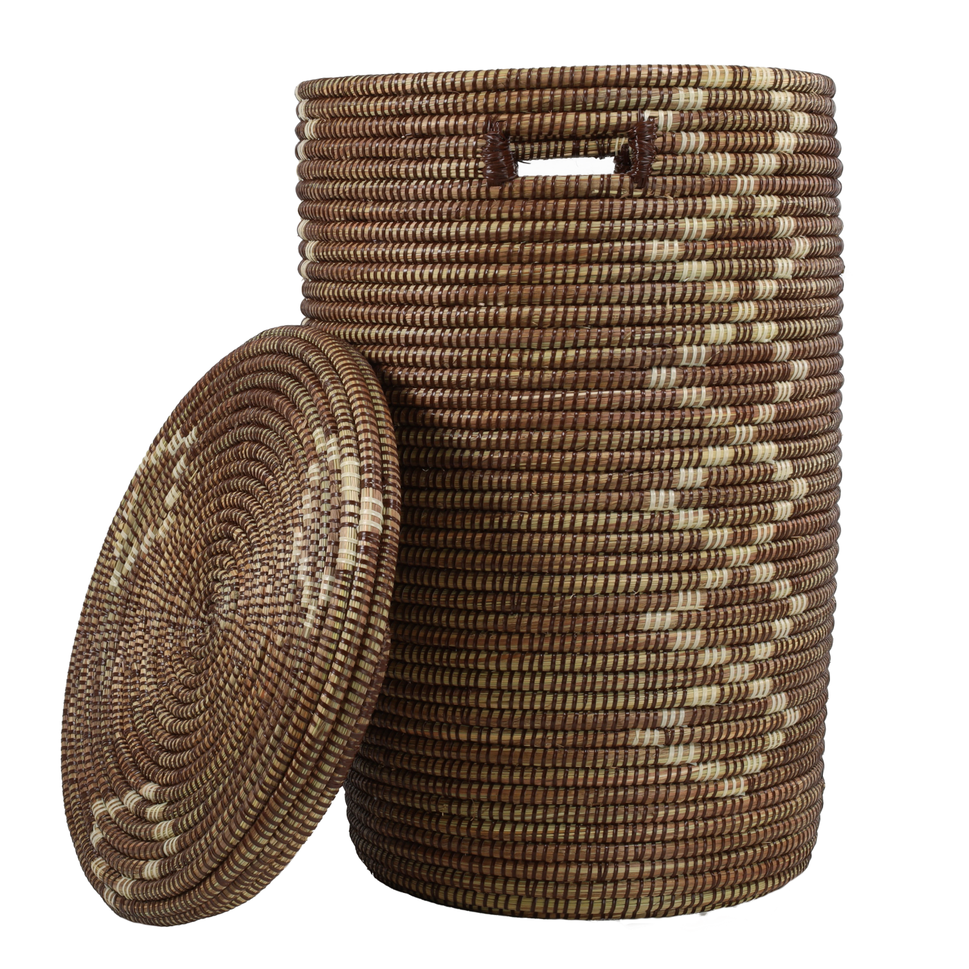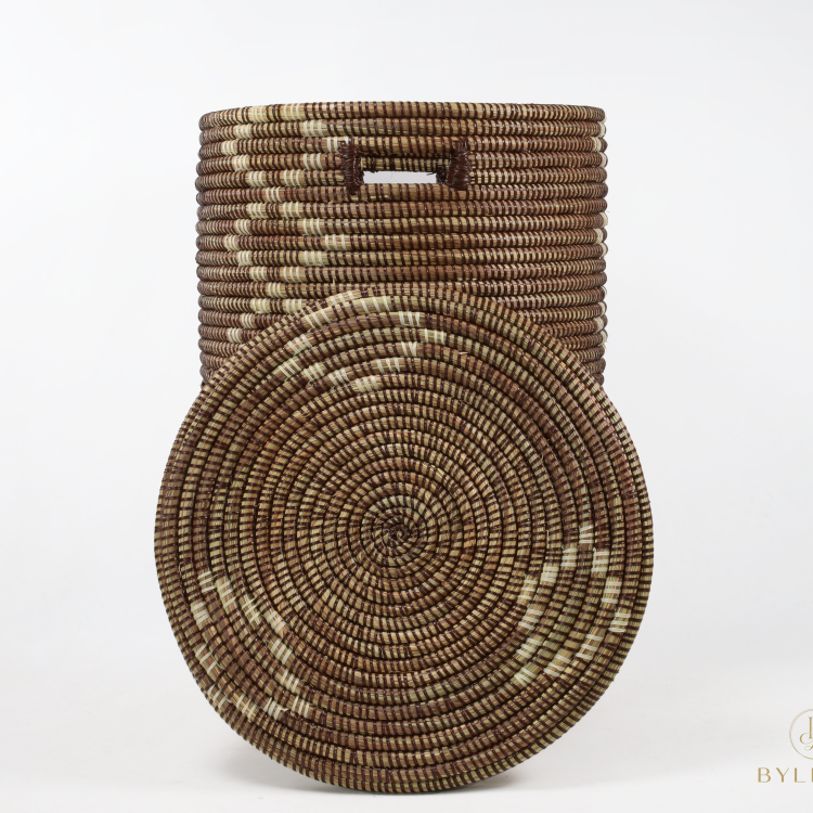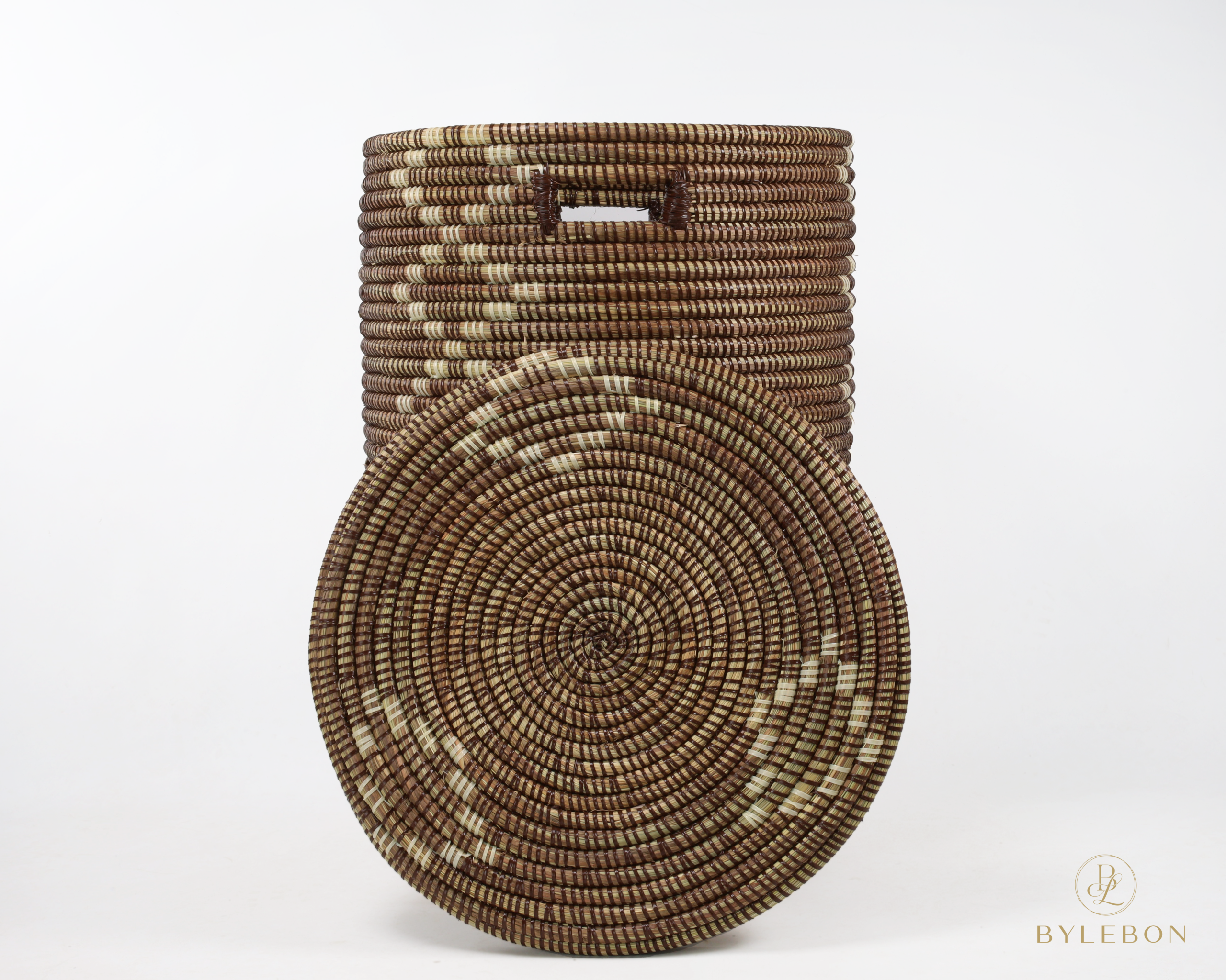 De Wasmand met deksel – ZigZag combineert praktisch gebruik met een moderne uitstraling. De mand is handgevlochten in een warme bruine tint en heeft een strak zigzag patroon dat direct opvalt maar toch rustig blijft in het interieur. Met een diameter van ca. 40 cm en een hoogte van ca. 60 cm biedt de mand voldoende ruimte voor kleding, handdoeken of beddengoed.